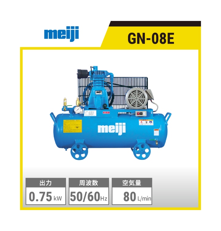 GN-08E 明治機械製作所 給油式コンプレッサ 自動アンローダ式 | 出力:0.75kW 吐出し空気量:80L/min 制御圧力:0.78~0.98MPa 騒音値:71dB(A) 空気タンク内蔵:38L