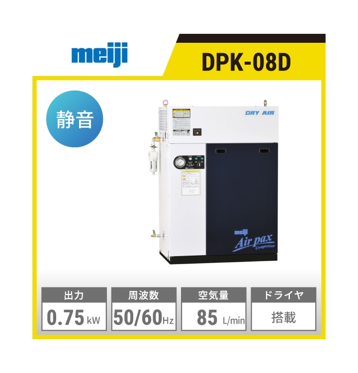 DPK-08D 明治機械製作所 給油式パッケージコンプレッサ ドライパックス エアドライヤ付 | 出力:1.5kW 吐出し空気量:85L/min 制御圧力:0.69~0.88MPa 騒音値:53dB(A) 空気タンク内蔵:31L