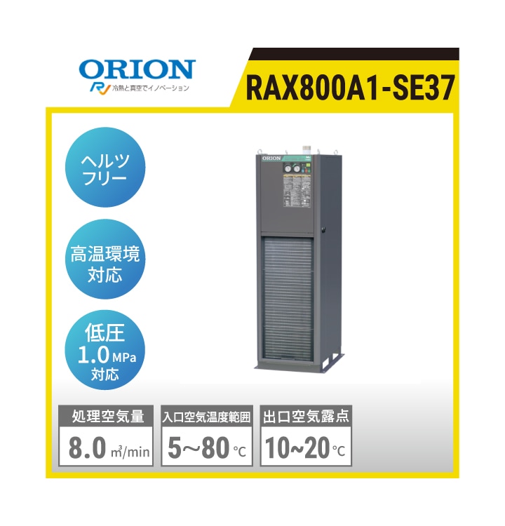 RAX800A1-SE37 オリオン機械 ヘルツフリードライヤ(空冷式) | 高温入気温度タイプ 処理空気量:8.0㎥/min 使用周囲温度:32℃ 入口空気温度:55℃ 出口空気圧力露点:10+1℃ 質量:84kg