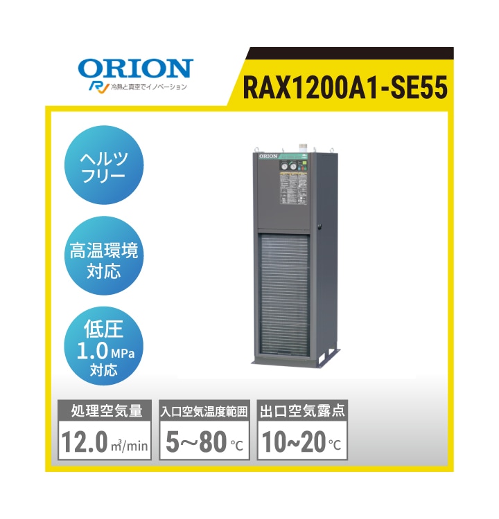 RAX1200A1-SE55 オリオン機械 ヘルツフリードライヤ(空冷式) | 高温入気温度タイプ 処理空気量:12.0㎥/min 使用周囲温度:32℃ 入口空気温度:55℃ 出口空気圧力露点:10+1℃ 質量:126kg