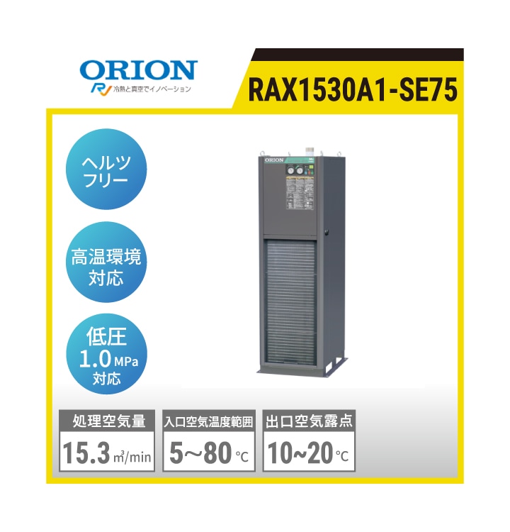 RAX1530A1-SE75 オリオン機械 ヘルツフリードライヤ(空冷式) | 高温入気温度タイプ 処理空気量:15.3㎥/min 使用周囲温度:32℃ 入口空気温度:55℃ 出口空気圧力露点:10+1℃ 質量:179kg