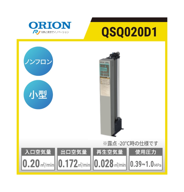 QSQ020D1 オリオン機械 ヒートレス(吸着式)エアードライヤー | スタンダードタイプ QSQ小型 露点:-20℃ 入口空気量:0.20㎥/min 出口空気量:0.172㎥/min 電源(50/60Hz):単相100~230
