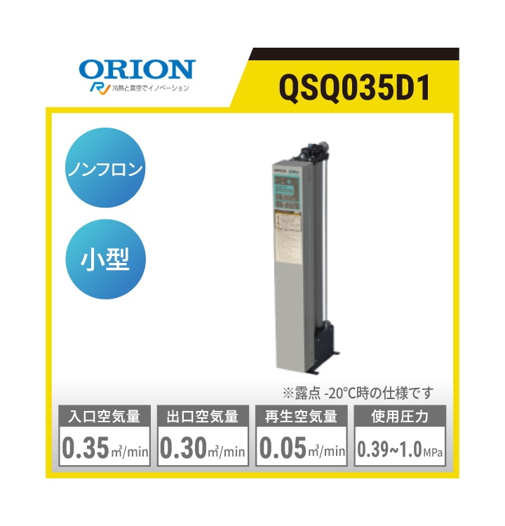 QSQ035D1 オリオン機械 ヒートレス(吸着式)エアードライヤー | スタンダードタイプ QSQ小型 露点:-20℃ 入口空気量:0.35㎥/min 出口空気量:0.30㎥/min 電源(50/60Hz):単相100~230