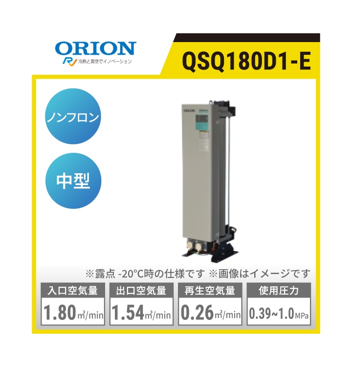QSQ180D1-E オリオン機械 ヒートレス(吸着式)エアードライヤー | スタンダードタイプ QSQ中型 露点:-20℃ 入口空気量:1.80㎥/min 出口空気量:1.54㎥/min 電源(50/60Hz):単相100~230