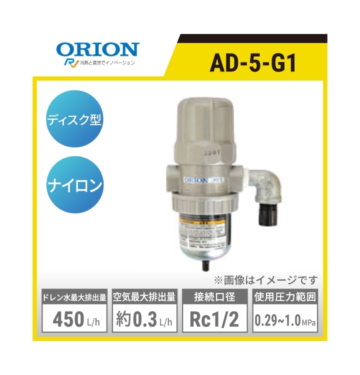AD-5-G1 オリオン機械 機械式(ディスク型)オートドレントラップ | ディスク型 最大排出量(ドレン水):450L/h 最大排出量(空気):約0.3L/回 使用圧力範囲:0.29~1.0MPa