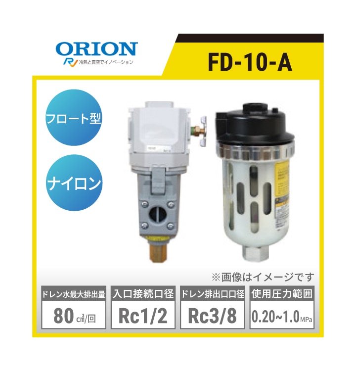 FD-10-A オリオン機械 機械式オートドレントラップ | フロート型 ナイロン 最大排出量(ドレン水):80㎥/回 使用圧力範囲:0.20~1.0MPa 使用温度範囲:2~60℃
