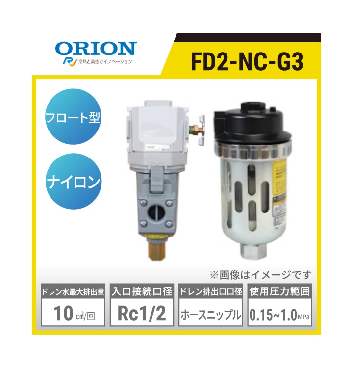 FD2-NC-G3 オリオン機械 機械式オートドレントラップ | フロート型 ナイロン NC仕様 最大排出量(ドレン水):10㎥/回 使用圧力範囲:0.1~1.0MPa 使用温度範囲:2~60℃