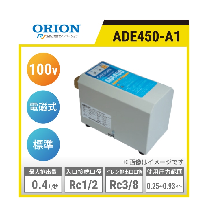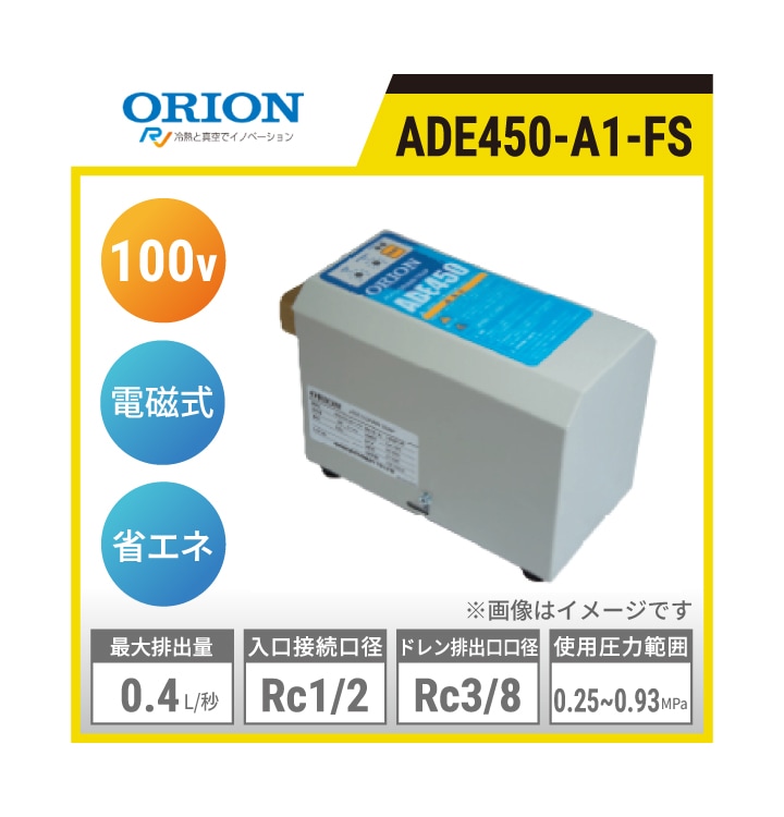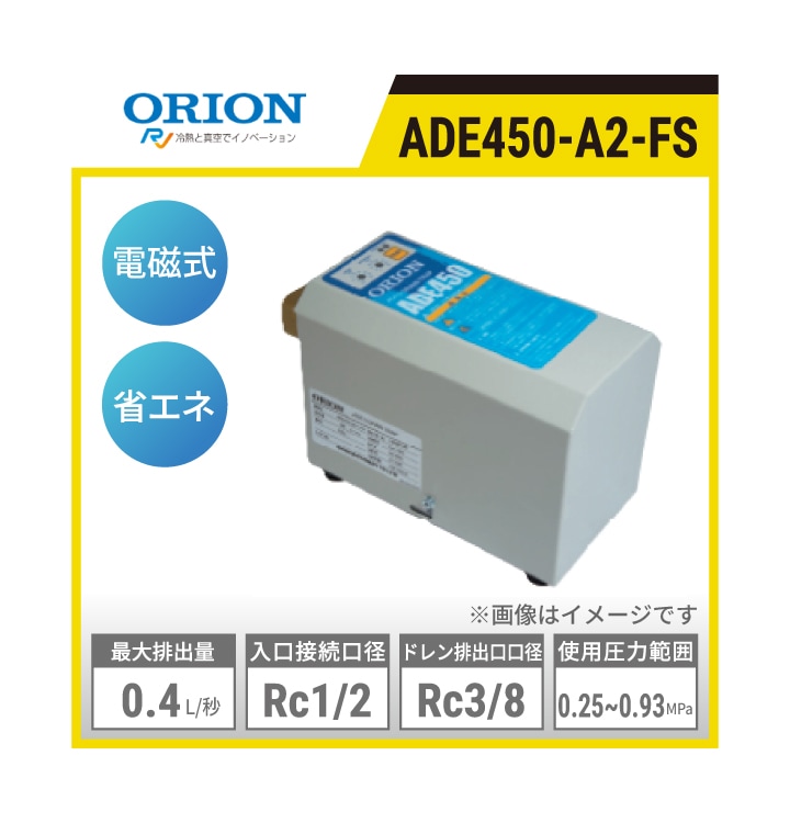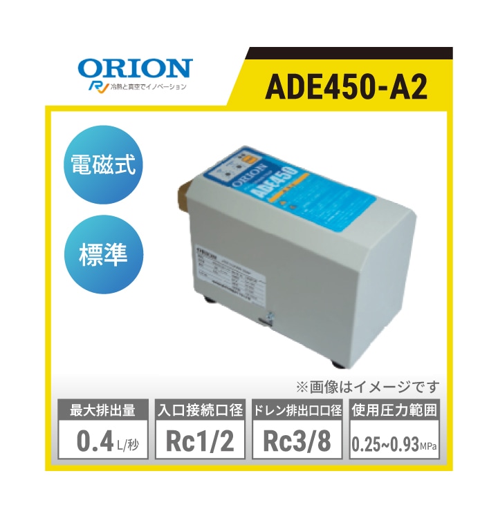 ADE450-A2-FS オリオン機械 電磁式オートドレントラップ(タイマー付) |省エネタイプ 最大排出量(タイマー):0.4(0.69MPa)L/秒 使用圧力範囲:0.25~0.93MPa 排出方式:電磁式・タイマー付き 単相200V