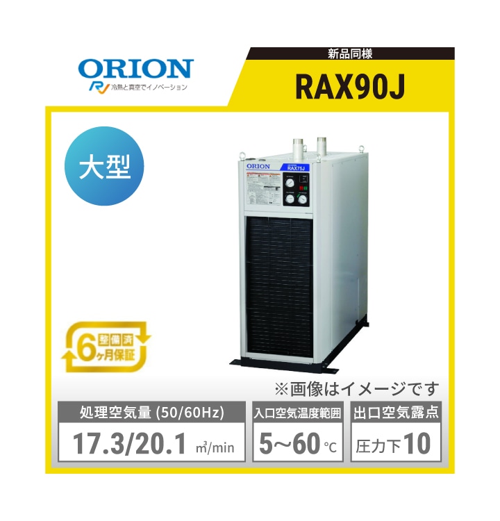 【新品同様】RAX90J オリオン機械 大型冷凍式エアードライヤー | 標準入気温度タイプ 空冷式 処理空気量(50/60Hz):17.3/20.1㎥/min 入口空気温度:5~60℃ 使用圧力範囲:0.29-0.98MPa