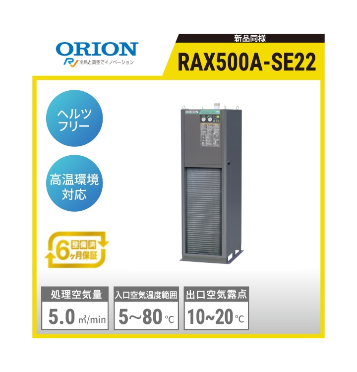 RAX500A-SE22 オリオン機械 ヘルツフリードライヤ(空冷式) | 高温入気温度タイプ 処理空気量:5.0㎥/min 使用周囲温度:32℃ 入口空気温度:55℃ 出口空気圧力露点:10+1℃ 質量:68kg