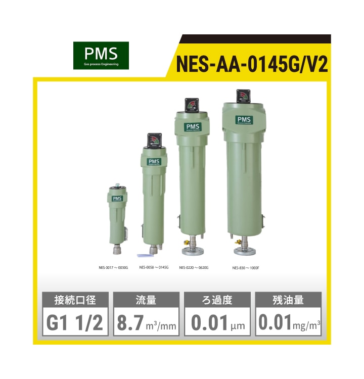 NES-AA-0080G/V2 PMS(ピーエムエス) 圧縮空気フィルタ | NESシリーズ 接続径:G1 流量:4.8㎥/min 質量:3.2kg ろ過度:0.01μm 残油量:0.01mg/㎥