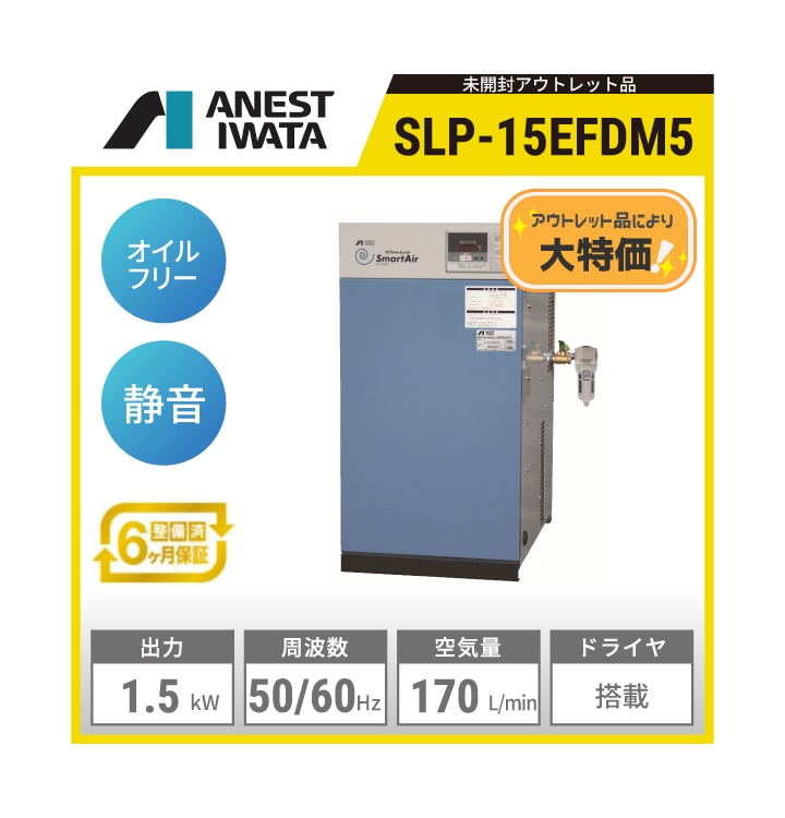 【アウトレット品】SLP-15EFDM5 アネスト岩田 オイルフリースクロールコンプレッサー | 出力:1.5kW 吐出し空気量:170L/min 制御圧力:0.65~0.8MPa 騒音値:45dB(A) 空気タンク内蔵:20L