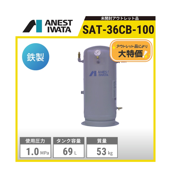 【アウトレット品】SAT-36CB-100 アネスト岩田 空気タンク | タンク容積:36L 最高使用圧力:1.0MPa 質量:20kg 鉄製