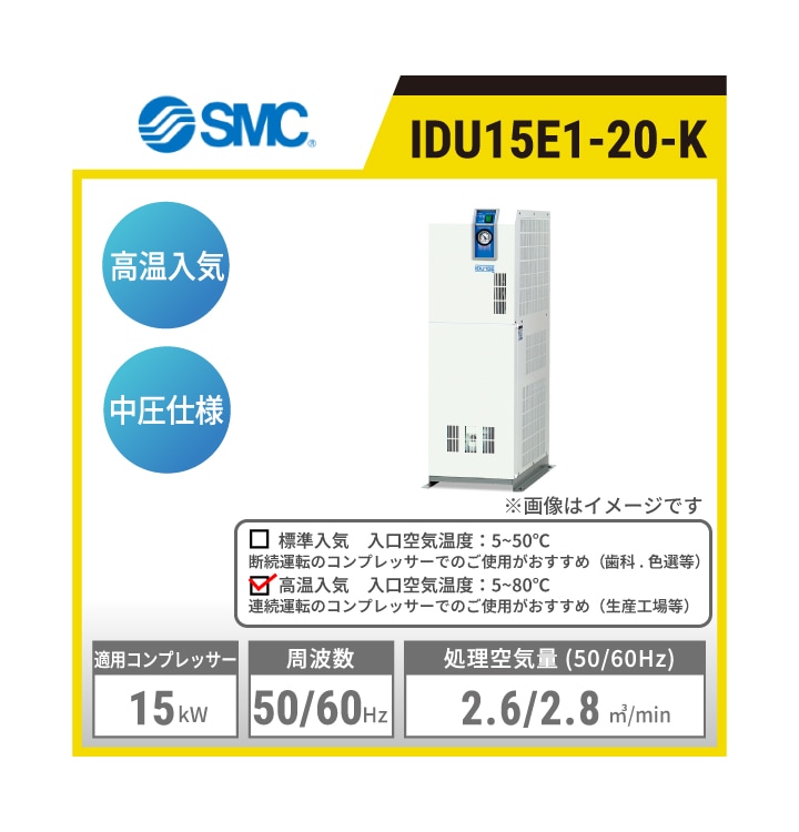IDU15E1-20-K SMC 冷凍式エアドライヤ | 高温入気対応 中圧仕様 処理空気量(50/60Hz):2.6/2.8㎥/min 入口空気温度:5~80℃ 出口空気圧力露点:10℃ 適用コンプレッサ出力目安:15kW 単相AC200V