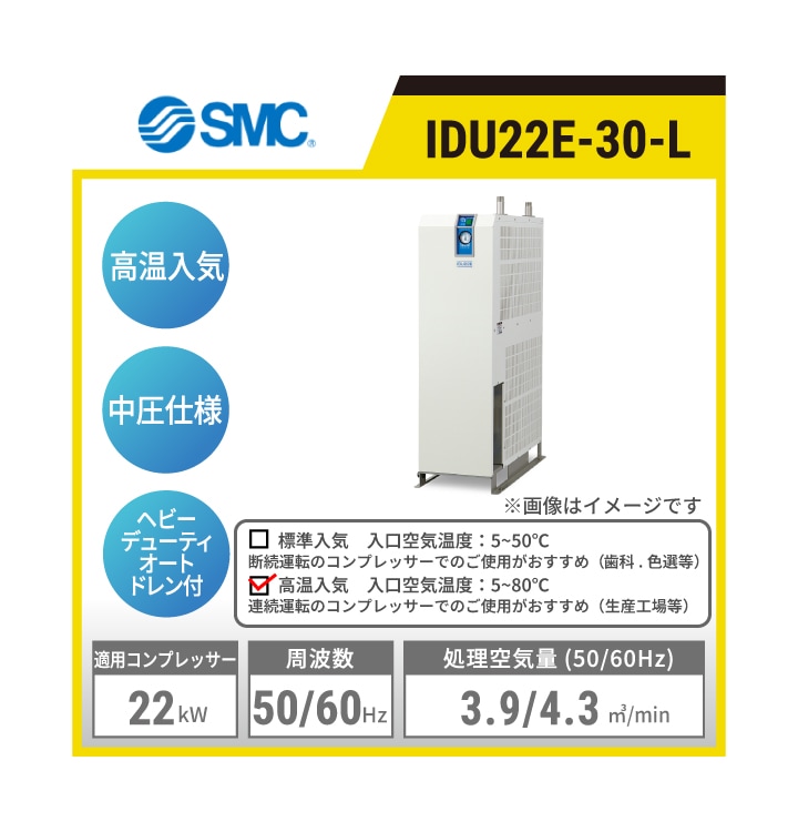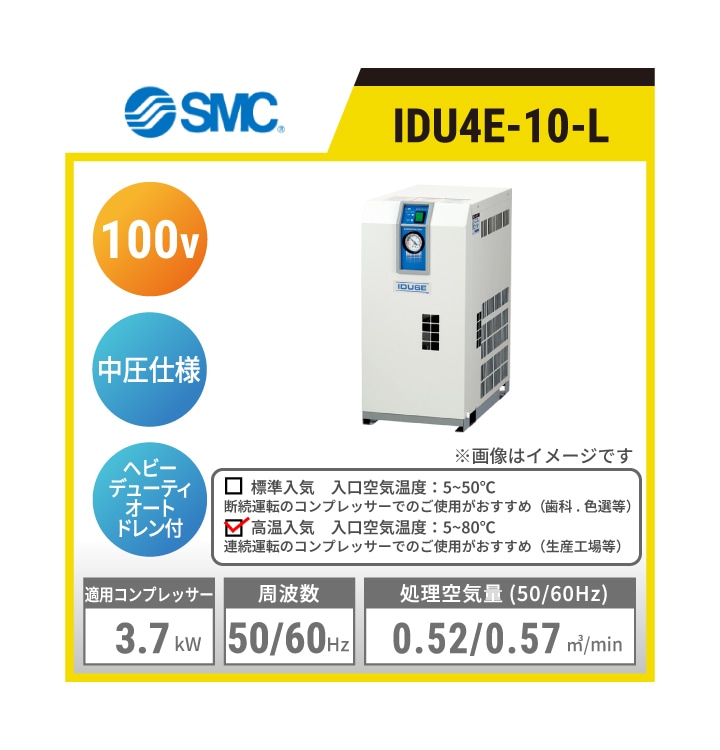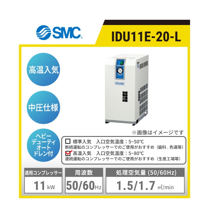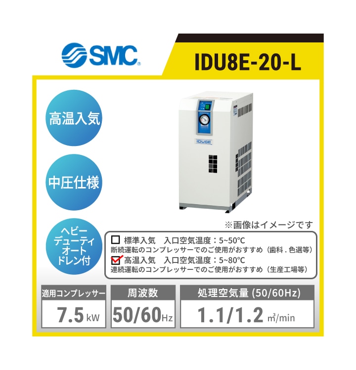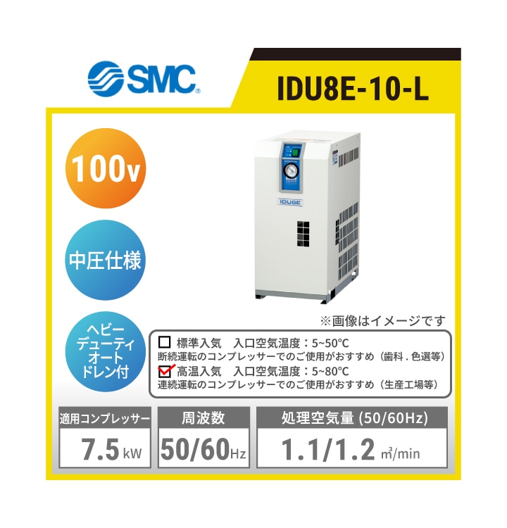 IDU8E-10-L SMC 冷凍式エアドライヤ | 高温入気対応 中圧仕様 処理空気量(50/60Hz):1.1/1.2㎥/min 入口空気温度:5~80℃ 出口空気圧力露点:10℃ 適用コンプレッサ出力目安:7.5kW 単相AC100V
