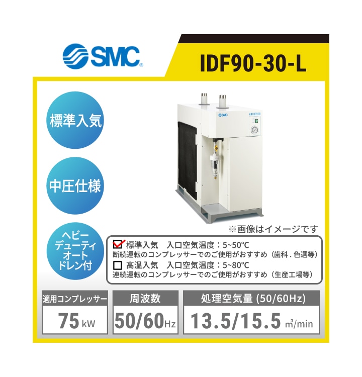 IDF90-30-L SMC 冷凍式エアドライヤ | 標準入気タイプ 中圧仕様 処理空気量(50/60Hz):13.5/15.5㎥/min 入口空気温度:5~65℃ 出口空気圧力露点:10℃ 適用コンプレッサ出力目安:75kW 三相AC200V