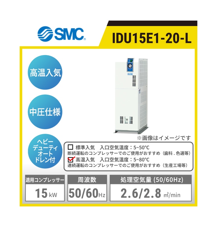 IDU15E1-20-L SMC 冷凍式エアドライヤ | 高温入気対応 中圧仕様 処理空気量(50/60Hz):2.6/2.8㎥/min 入口空気温度:5~80℃ 出口空気圧力露点:10℃ 適用コンプレッサ出力目安:15kW 単相AC200V