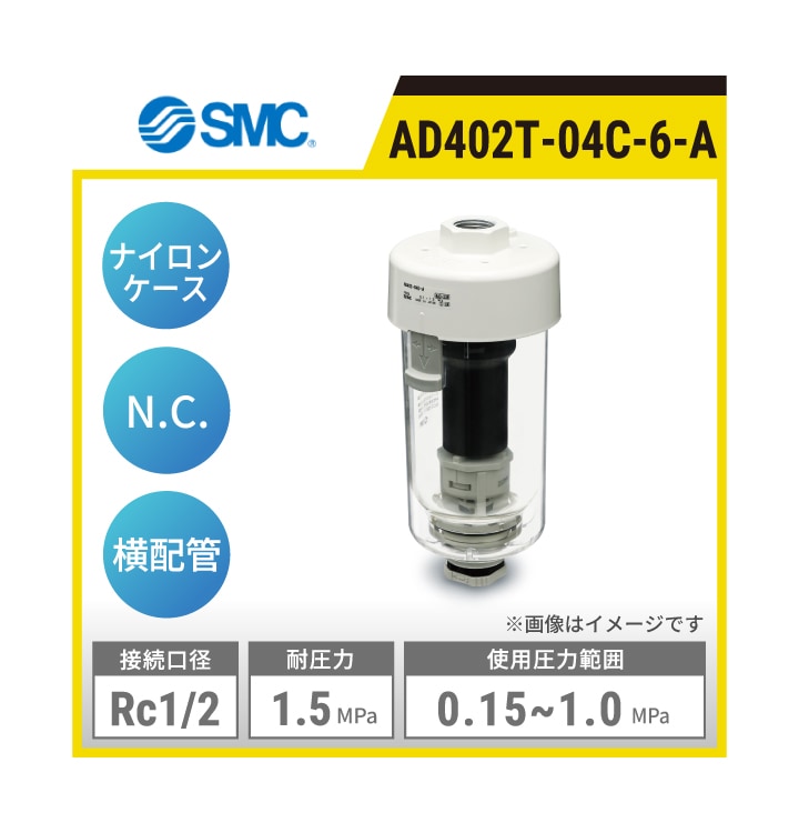 AD402T-04C-6-A SMC オートドレンバルブ | ナイロンケース オートドレンタイプ:N.C 接続口径:Rc1/2 使用圧力範囲:0.15~1.0MPa 耐圧力:1.5MPa 配管方向:横配管