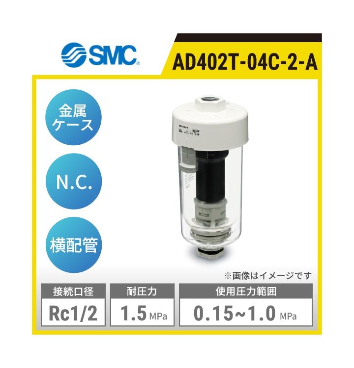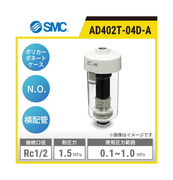 AD402T-04C-A SMC オートドレンバルブ | ポリカーポネートケース オートドレンタイプ:N.C 接続口径:Rc1/2 使用圧力範囲:0.15~1.0MPa 耐圧力:1.5MPa 配管方向:横配管