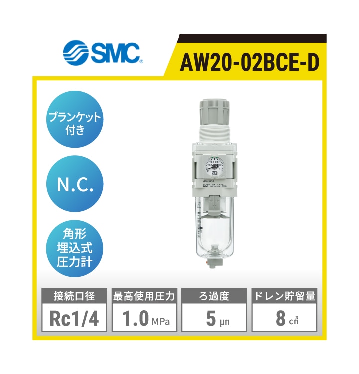 AW20-02BCE-D SMC フィルタレギュレータ | 接続口径:Rc1/4 最高使用圧力:1.0MPa ろ過度:5μm ドレン貯留量:8㎤ ブラケット付 圧力計:角形埋込式 オートドレンタイプ:N.C