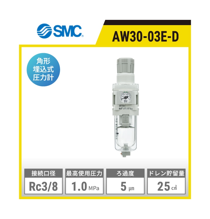 AW30-03E-D SMC フィルタレギュレータ | 接続口径:Rc3/8 最高使用圧力:1.0MPa ろ過度:5μm ドレン貯留量:25㎤ 圧力計:角形埋込式