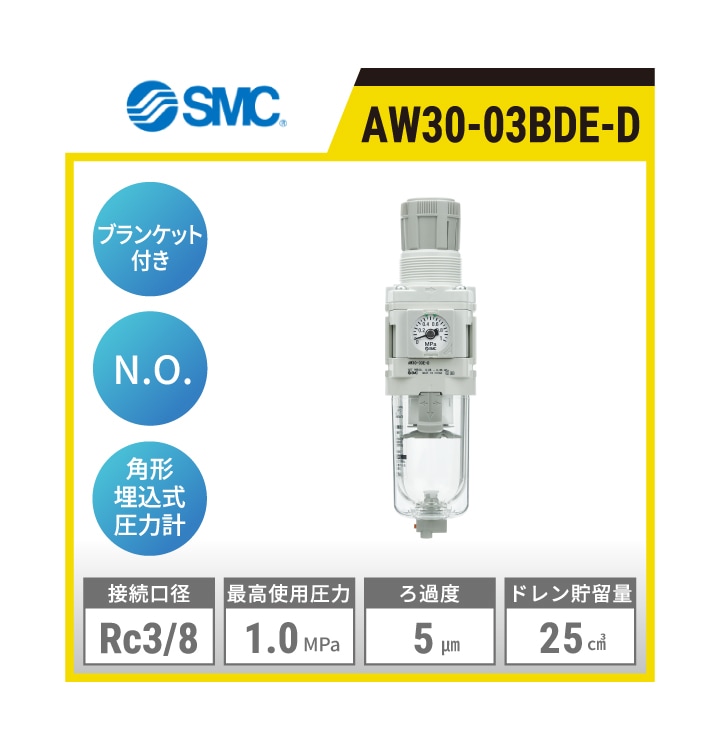 AW30-03DE-D SMC フィルタレギュレータ | 接続口径:Rc3/8 最高使用圧力:1.0MPa ろ過度:5μm ドレン貯留量:25㎤ 圧力計:角形埋込式 オートドレンタイプ:N.O