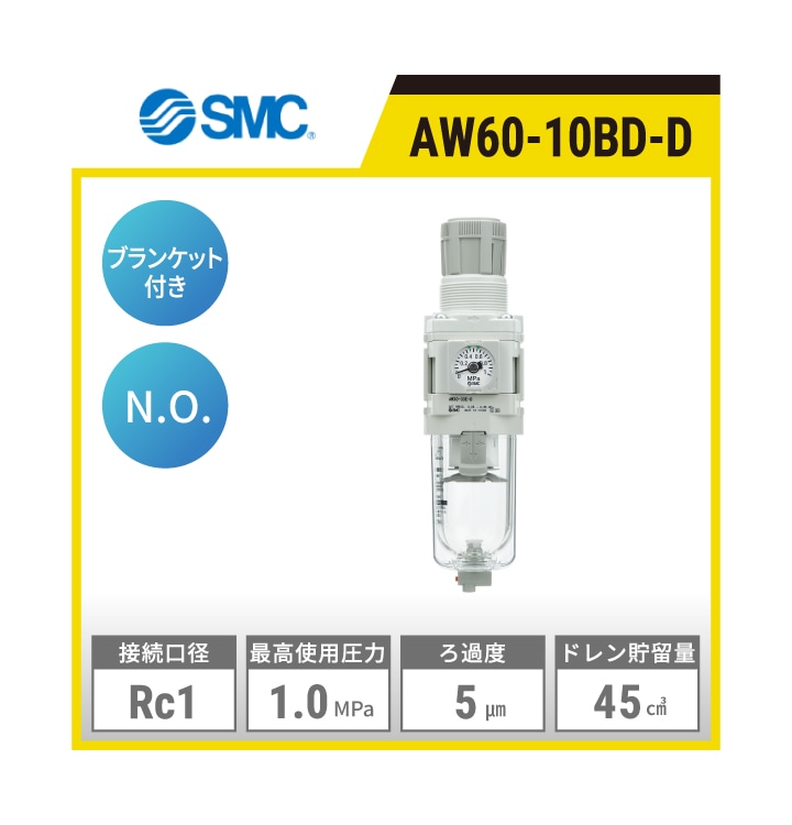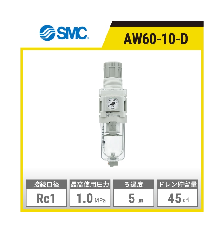 AW60-10D-D SMC フィルタレギュレータ | 接続口径:Rc1 最高使用圧力:1.0MPa ろ過度:5μm ドレン貯留量:45㎤ オートドレンタイプ:N.O.