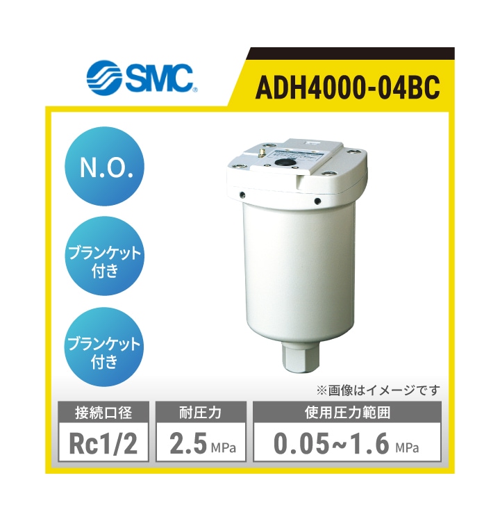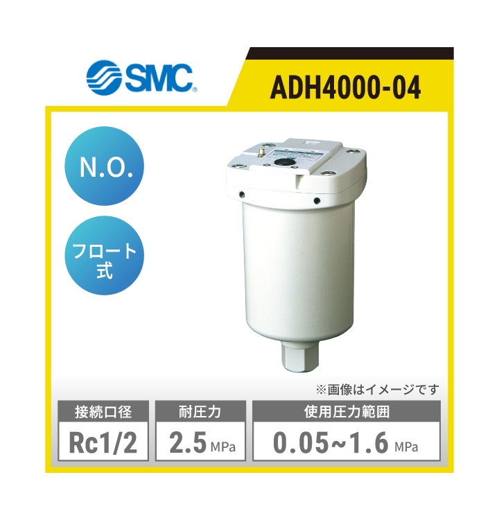 ADH4000-04 SMC ヘビーデューティオートドレン | オートドレン方式:フロート式 接続口径:Rc1/2 使用圧力範囲:0.05~1.6MPa 耐圧力:2.5MPa オートドレン仕様:N.O.