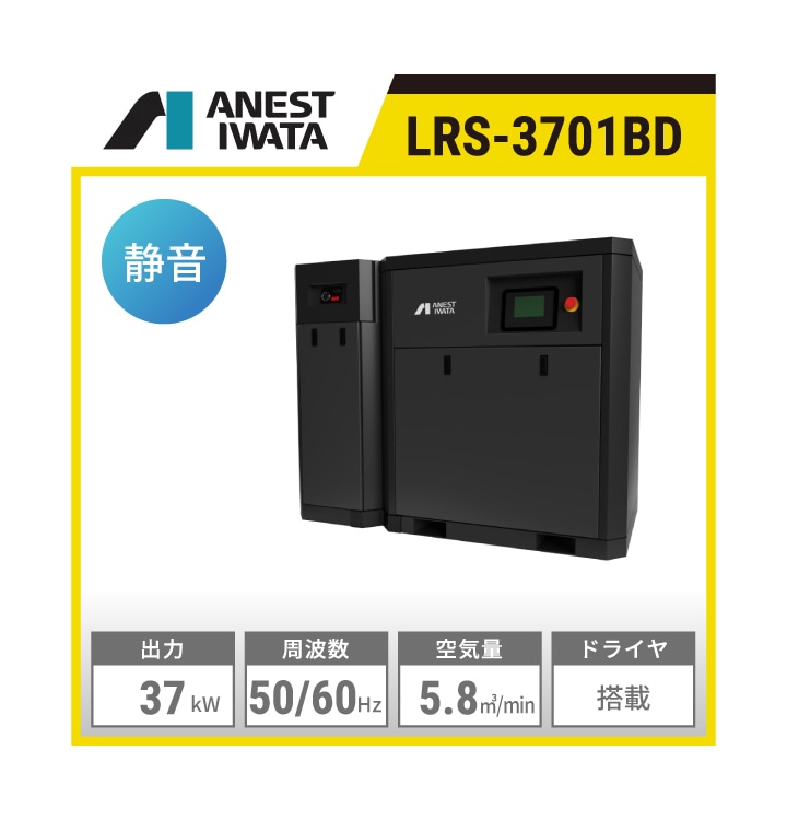 LRS-3701BD アネスト岩田 給油式スクリューコンプレッサー | 出力:37kW 吐出し空気量:5.8㎥/min 制御圧力:0.9~1.0MPa 騒音値:66dB(A)
