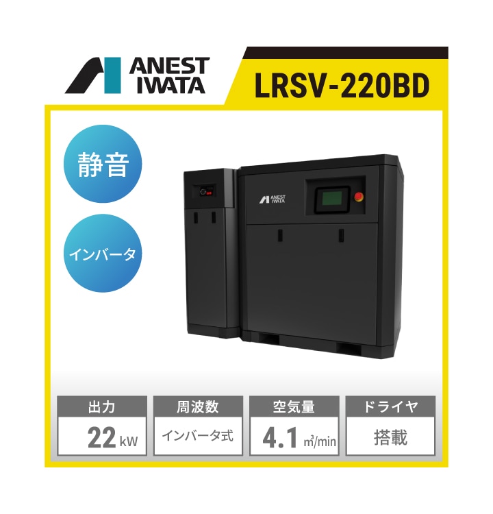 LRSV-220BD アネスト岩田 給油式スクリューコンプレッサー | 出力:22kW 吐出し空気量:4.15㎥/min インバータ制御圧力:0.45~0.65MPa 騒音値:63dB(A)