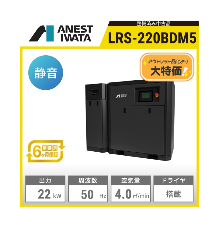 SOLD OUT 【整備済み中古品】LRS-220BDM5 アネスト岩田 オイル式スクリューコンプレッサー | 出力:22kW 吐出し空気量:4.0㎥㎥/min 制御圧力:0.6~0.7MPa 騒音値:63dB(A) 周波数:50Hz