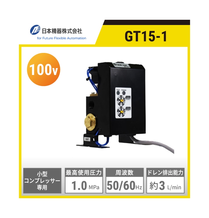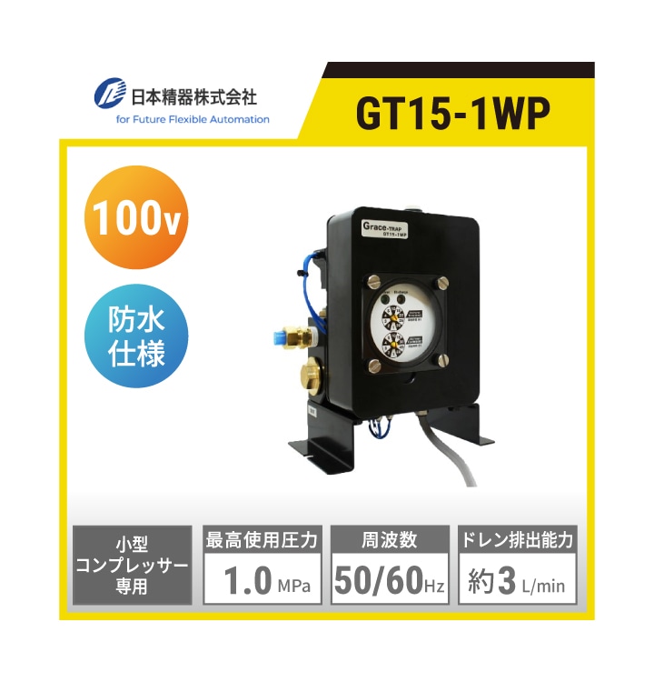 GT15-1WP 日本精器 ドレントラップ Grace-Trap | 屋外防水仕様 標準仕様 小型コンプレッサー用 最高使用圧力:1.0MPa ドレン排出能力:約3.0L/min(0.7MPa時) AC100V 50Hz/60Hz兼用