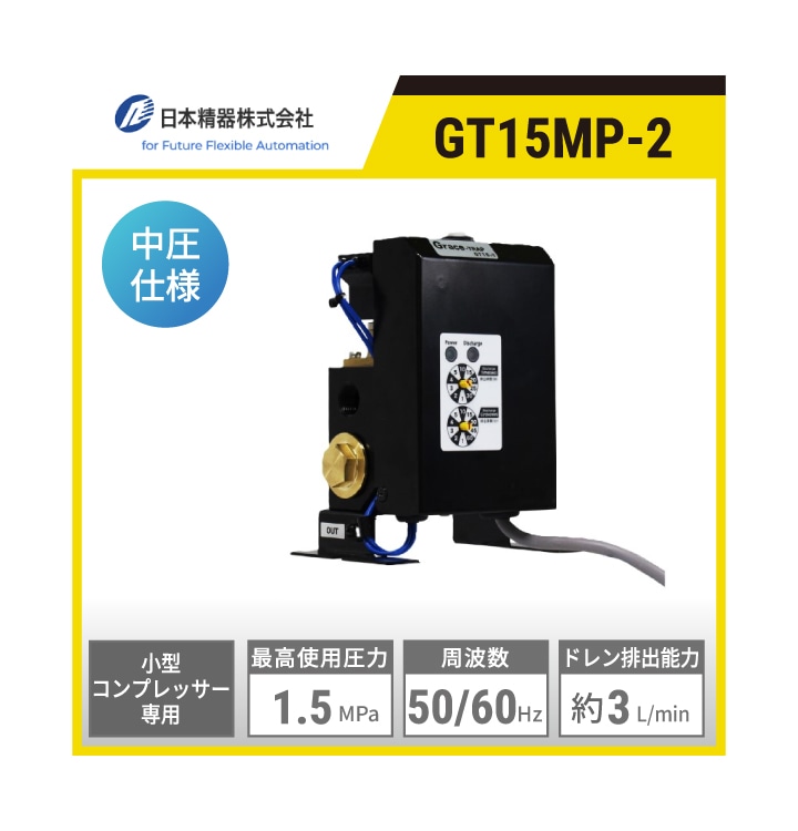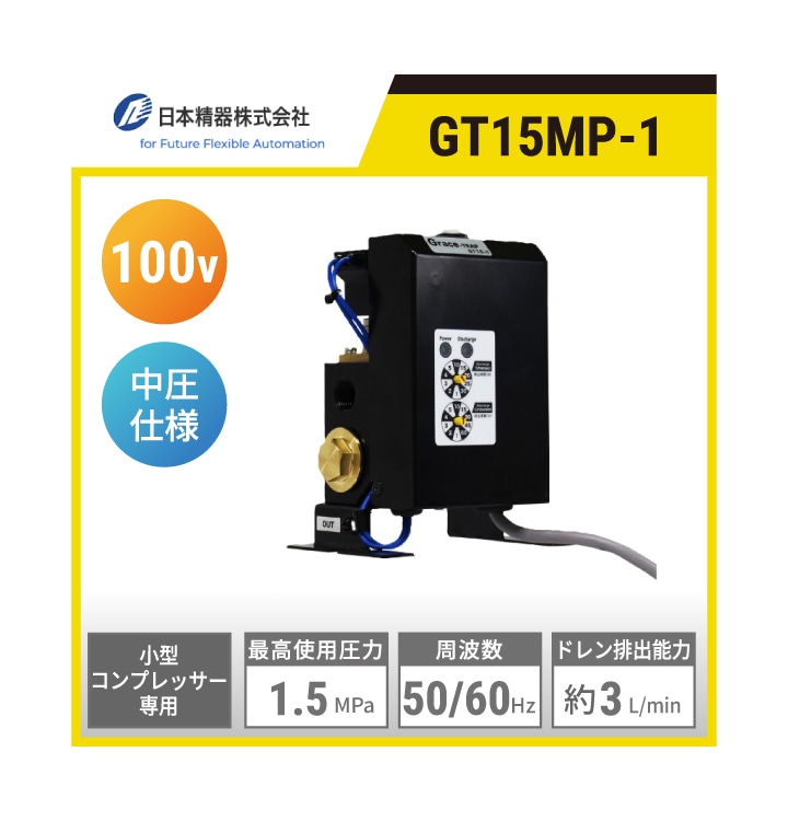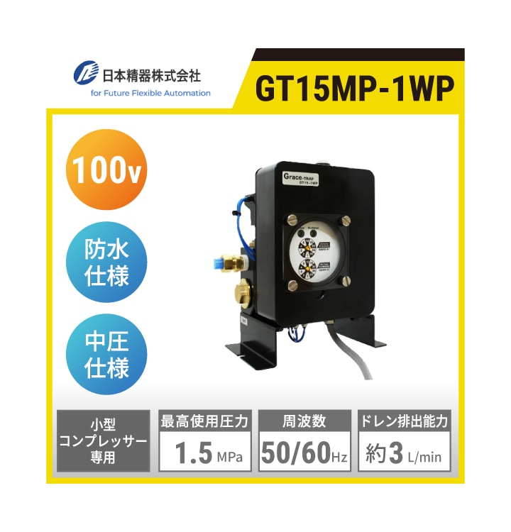 GT15MP-1WP 日本精器 ドレントラップ Grace-Trap | 屋外防水仕様 中圧仕様 小型コンプレッサー用 最高使用圧力:1.5MPa ドレン排出能力:約3.0L/min(0.7MPa時) AC100V 50Hz/60Hz兼用