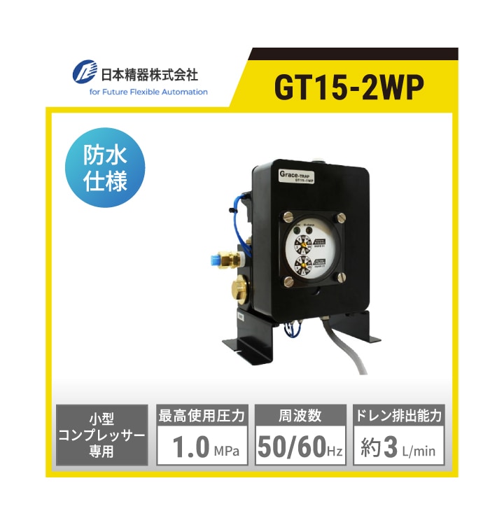 GT15-2WP 日本精器 ドレントラップ Grace-Trap | 屋外防水仕様 標準仕様 小型コンプレッサー用 最高使用圧力:1.0MPa ドレン排出能力:約3.0L/min(0.7MPa時) AC200V 50Hz/60Hz兼用