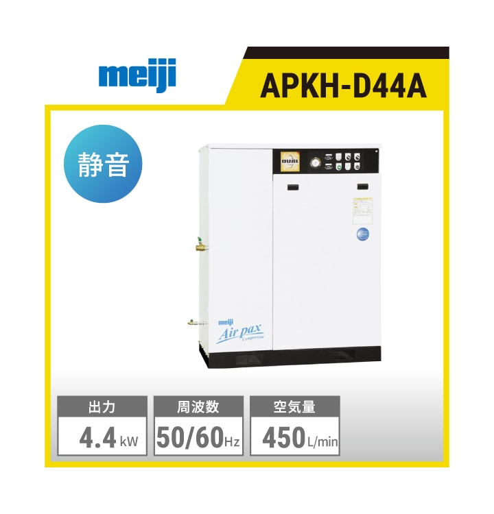 APKH-D44A 明治機械製作所 給油式中圧二段コンプレッサ 中圧デュアルパックス | 出力:4.4kW 吐出し空気量:450L/min 制御圧力:1.2~1.4MPa 騒音値:58dB(A) 空気タンク内蔵:9L