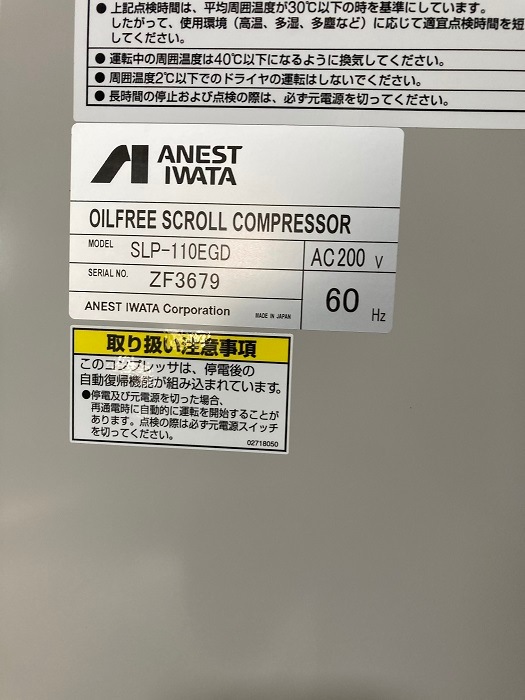 | 【整備済み中古品】 SLP-110EGDM6 アネスト岩田 オイルフリースクロールコンプレッサー | 60Hz 出力:11kW ドライヤ付き | 1 | ¥1,188,000 |