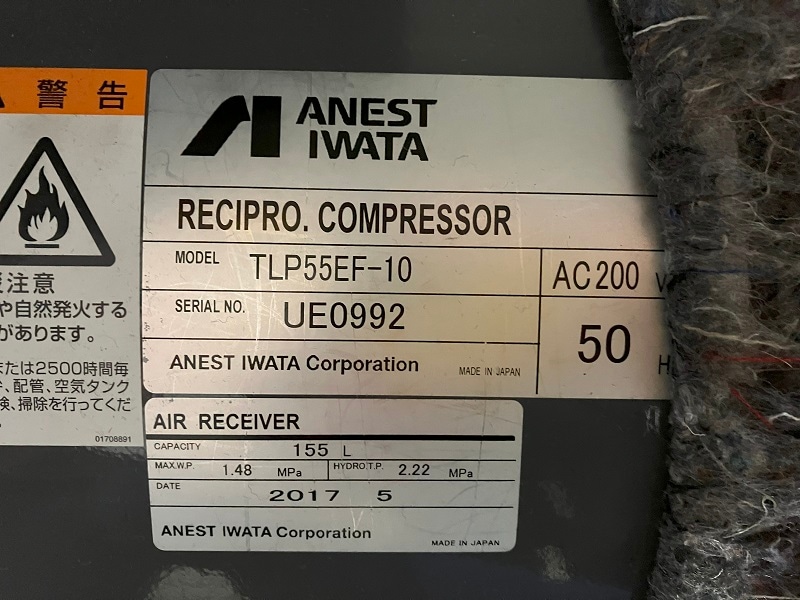 | 【整備済み中古品】 TLP55EG-10M5 アネスト岩田 給油式レシプロコンプレッサー | 50Hz 出力:5.5kW | 1 | ¥193,600 |
