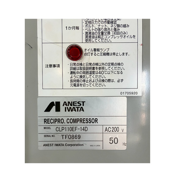 | 【整備済み中古品】 CLP110EF-14DM5 アネスト岩田 給油式レシプロパッケージコンプレッサー | 出力:11kW 吐出空気量:1075L/min 重量:443kg | 1 | ¥825,000 |