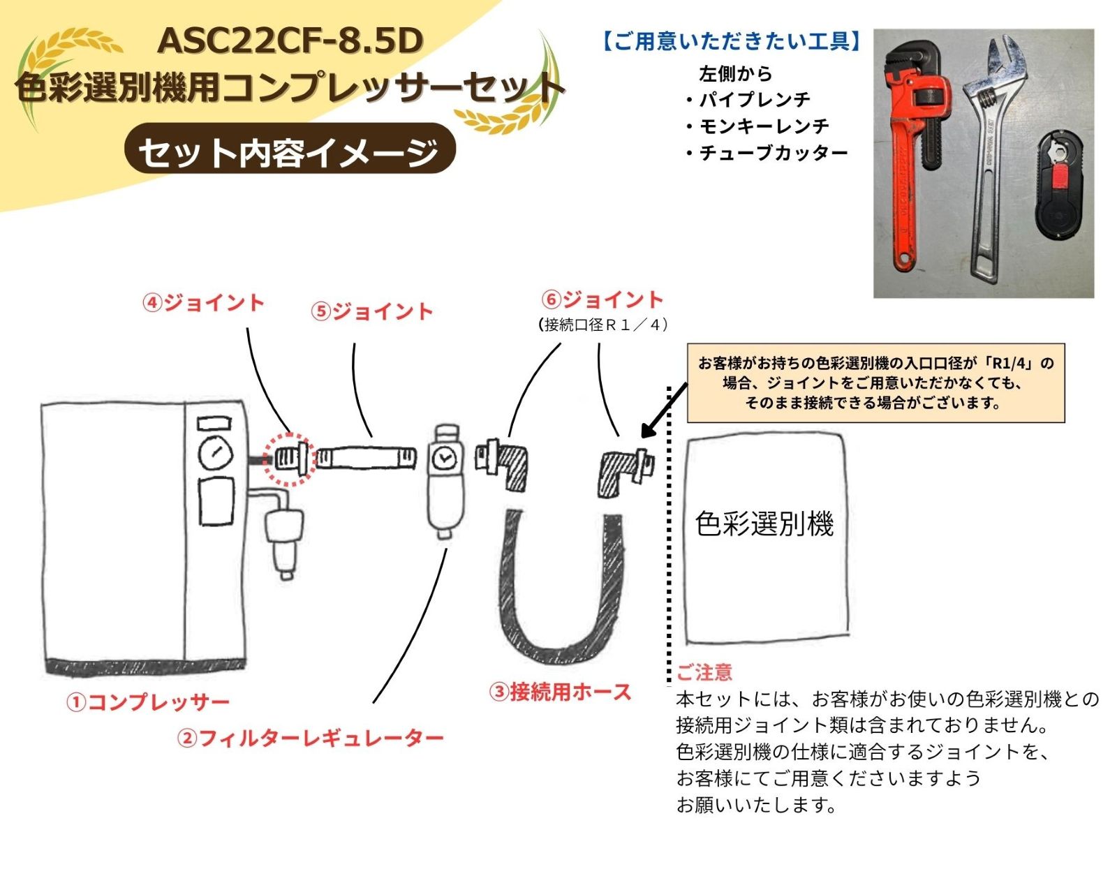色彩選別機とコンプレッサーを接続するために必要なジョイントは、別途ご用意いただく必要がございます。